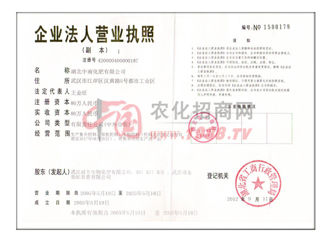 湖北中南化肥有限公司成立于2005年12月。中南化肥有限公司由美國(guó)S.K.X等中美兩國(guó)高科技企業(yè)合資興建,由武漢市批準(zhǔn)、湖北省工商行政管理局注冊(cè)登記的外資企業(yè)。中南化肥公司吸收了包括美國(guó)農(nóng)業(yè)博士、國(guó)內(nèi)農(nóng)業(yè)大學(xué)和科研單位的農(nóng)業(yè)教授、研究員和高級(jí)農(nóng)藝師在內(nèi)的一大批國(guó)際化肥方面的高級(jí)技術(shù)人才。中南(國(guó)際)化肥有限公司為中國(guó)化工學(xué)會(huì)化肥專業(yè)委員會(huì)團(tuán)體會(huì)員,華中農(nóng)業(yè)大學(xué)教學(xué)實(shí)習(xí)和科研成果轉(zhuǎn)化基地。