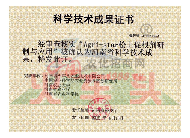 2015年松土促根劑項(xiàng)目經(jīng)河南省科技廳組織專家組進(jìn)行鑒定,達(dá)到國(guó)際先進(jìn)水平,國(guó)內(nèi)外沒(méi)有同類報(bào)道,被科技日?qǐng)?bào)譽(yù)為“修復(fù)土壤的保護(hù)神”;